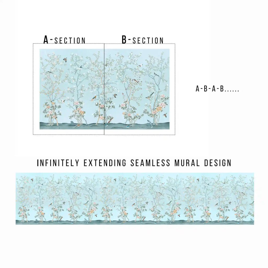Seamless Design — Chinoiserie mural wallpaper creates a continuous, uninterrupted flow across walls for a refined statement